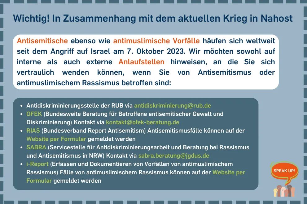 Die Veranstaltung ist für alle Studierenden und Mitarbeitenden der UA-Ruhr Universitäten (Bochum, Duisburg-Essen, Dortmund) geöffnet. Der Raum wird einige Tage vor der Veranstaltung bekanntgegeben.